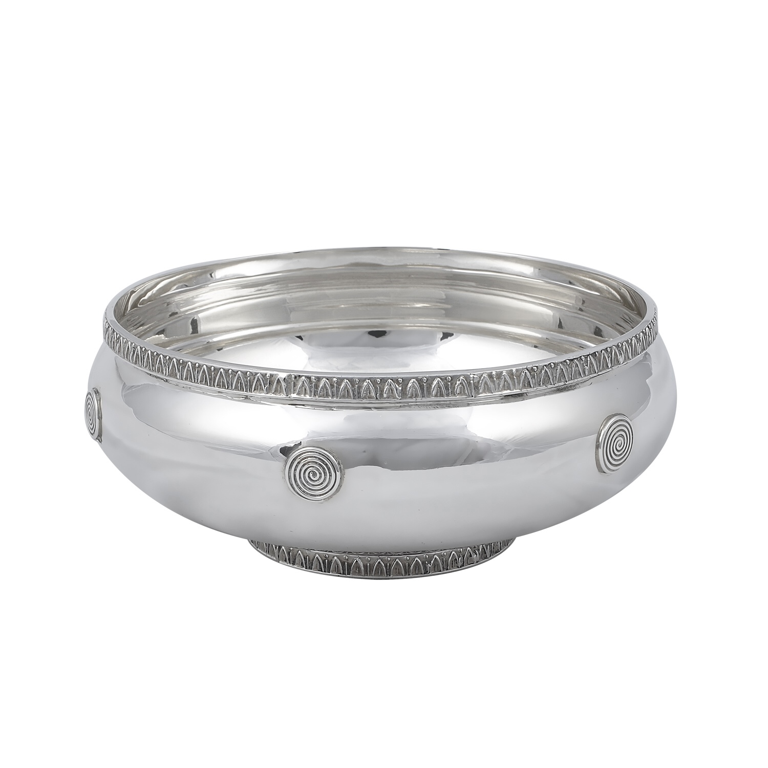 Μπωλ λείο με σπείρες και βάση, χειροποίητο από καθαρό ασήμι 925ᵒ. Διατηρώντας στοιχεία του κλασικού σχεδίου, τα νέα αυτά πιστά αντίγραφα από αρχαϊκά ευρήματα της ελληνικής επικράτειας, αποτελούν μικρά έργα τέχνης στο χώρο σας. Διαχρονικά σε στιλ και ποιότητα είναι εξαιρετικά δώρα υψηλής αισθητικής και αξίας.